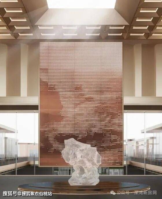 项目营销中心“缦”会馆未来将保留为业主专属会所,内部摆放多件艺术品:《玉・山》树脂雕塑,阳光透过玻璃洒下宛如“洒金”,寓意财源滚滚;《鎏金岁月》唐代铜板腐蚀艺术品彰显文化底蕴,旋转楼梯既是网红打卡点,更寓意“步步高升”。