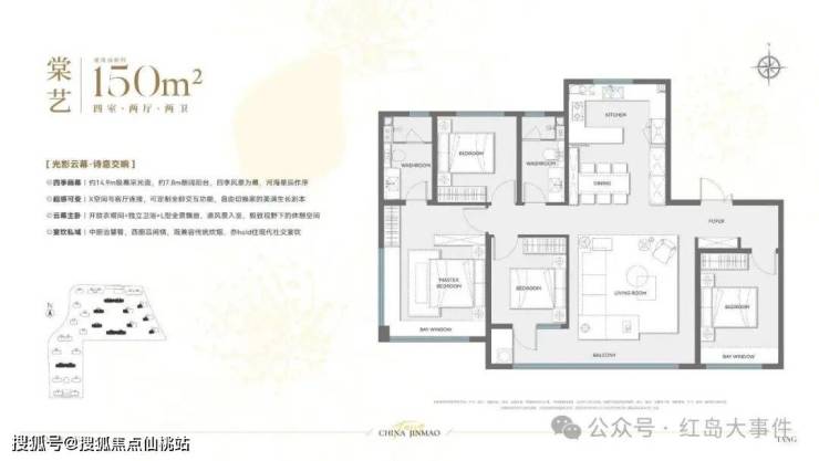 150㎡作为主力户型,近15米的南向开间,配置四房两厅两卫,书房、保姆间等一步到位,满足二胎甚至三代同堂家庭的需求。