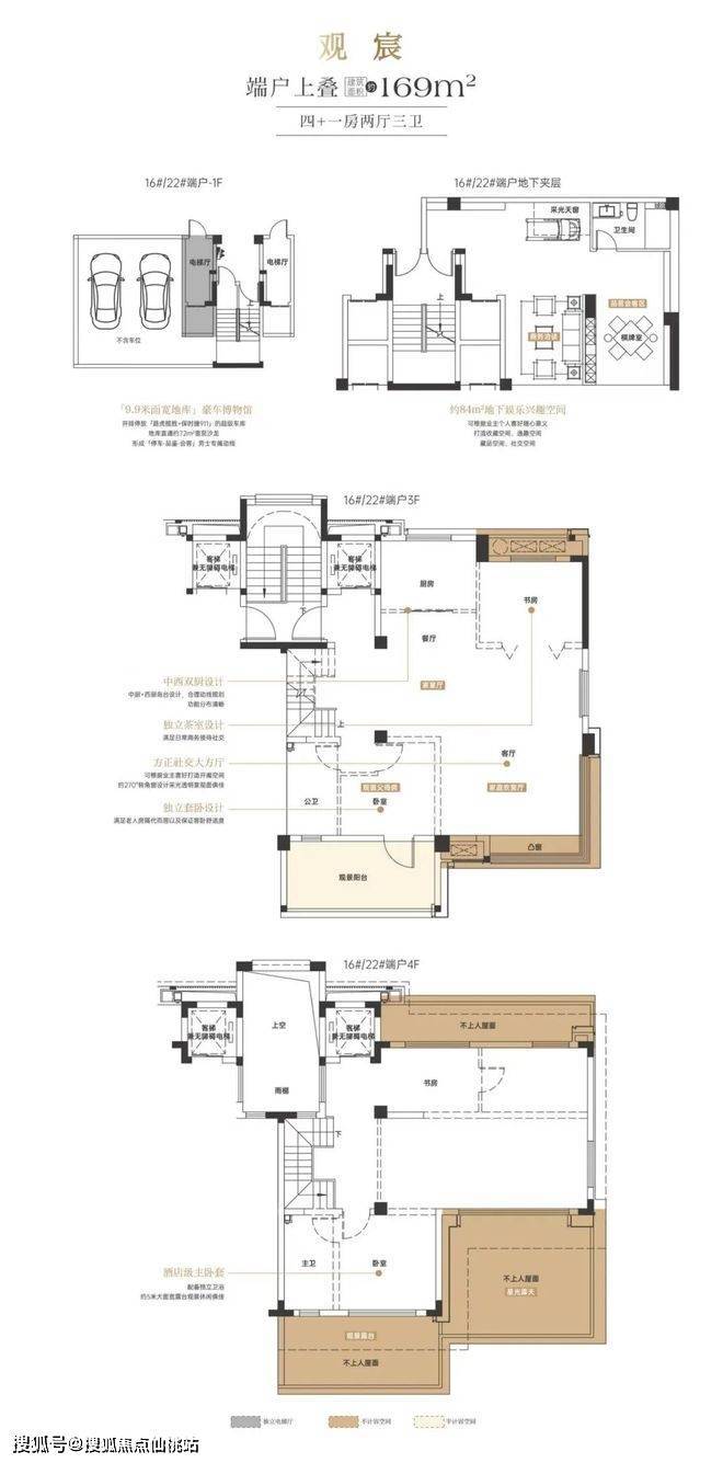 别墅产品为叠拼设计,一个显著特点是取消了市场上常见的“鸡肋”中叠,只保留上、下叠设计,这有效提升了产品的舒适度和私密性。面积段为169-178平方米左右,下叠产品带有包围式花园,上叠则有南北不计容露台。