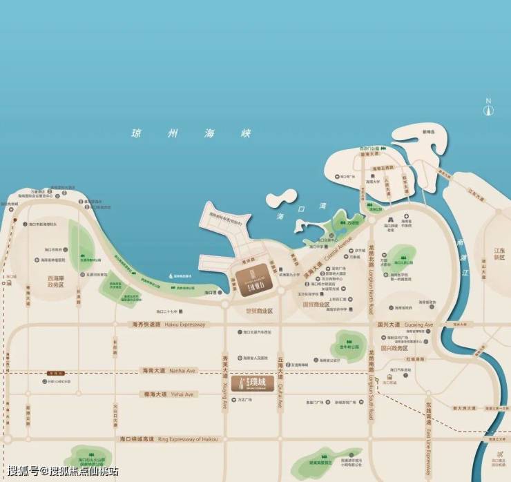 滨海大道(城市东西大动脉)、丘海大道、龙昆北路、海口东站(约6.5km)、海口火车站(约13.4km)、美兰国际机场(约19km)、国际邮轮母港秀英