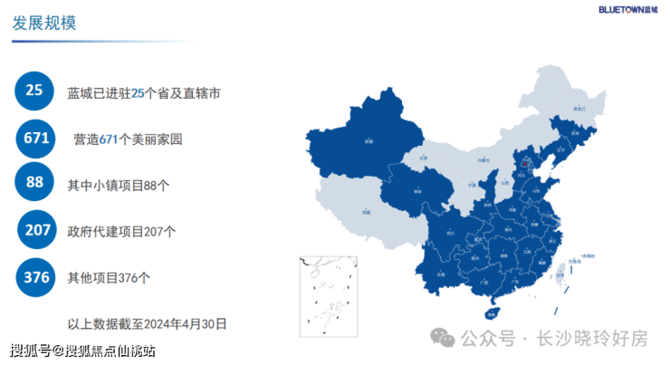 截至2024年4月30日,蓝城已进驻中国25个省及直辖市,营造671个美丽家园,其中小镇项目88个,政府代建项目207个,其他项目376个。2023年荣登代建规模第二、政府代建第三。