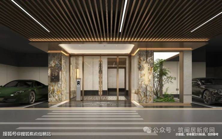 以“劳斯莱斯”徽标为原型灵感描画展翼门庭,约45米宽 ,15米高的恢弘规制,以高星酒店无雨落客区标准打造归家第一重仪式感。为居者铺陈雍容归家的尊贵礼