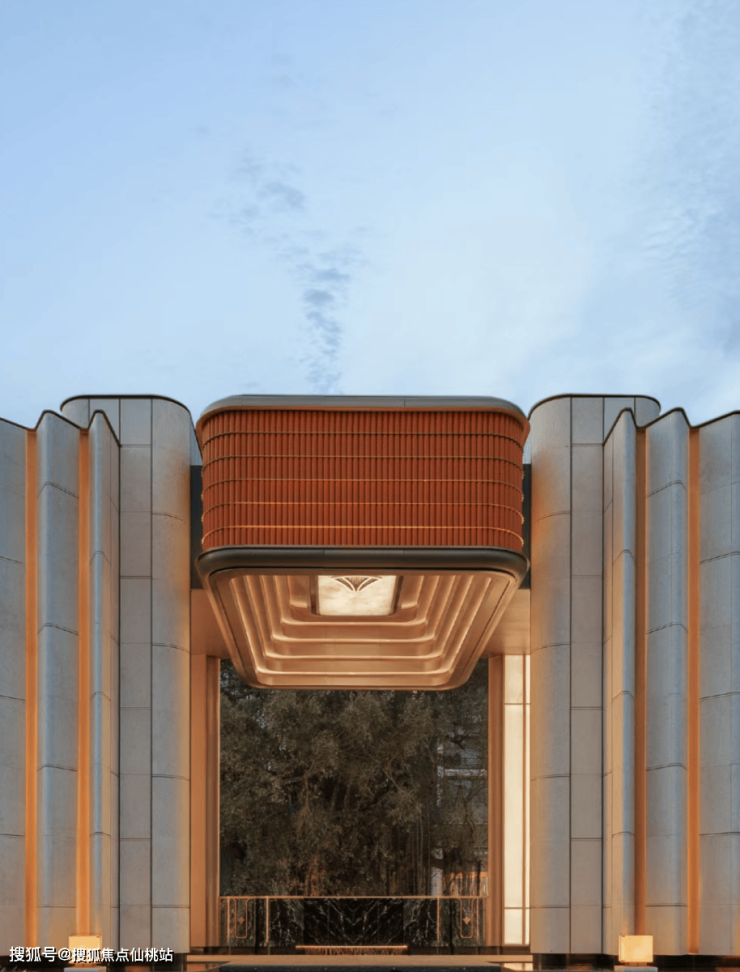 建筑的立面汲取海岸礁石的层叠意象,以错落堆搭的体量,摹写潮汐往复的天然韵律。横向延展的肌理,配合米白色石材的反弧面阵列,在光影中调和了厚重与飘逸,让建筑既具自然的沉淀感,又流露着呼吸般的轻盈。
