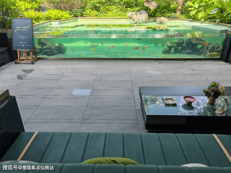 穿过归家大堂,便到达下沉流水庭院,这里复刻了莫奈花园的"梦幻锦鲤池",如同一个超大的鱼缸,业主的小孩可以在此赏鲤、喂鱼。