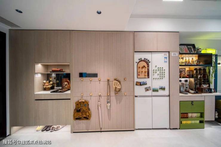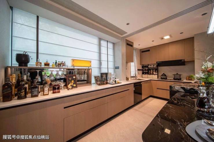 还有“山姆级”囤货厨房,针对菁英家庭的高频采购需求,通过升降吊柜和调料拉篮等精细设计,让瓶瓶罐罐以及小家电各有归处。