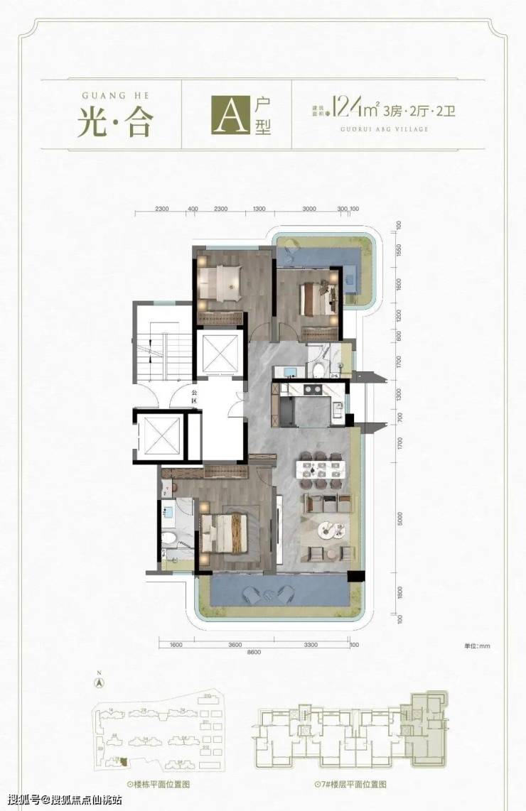 A 户型 101㎡的美居 2 + 1 房两厅两卫,约 10㎡灵动空间,可随心打造阅读角、健身房等;南向阳台开阔,种花养草、赏景聊天皆可;主卧套房独立明卫,私密又尊崇;餐厨一体,增进家人互动。