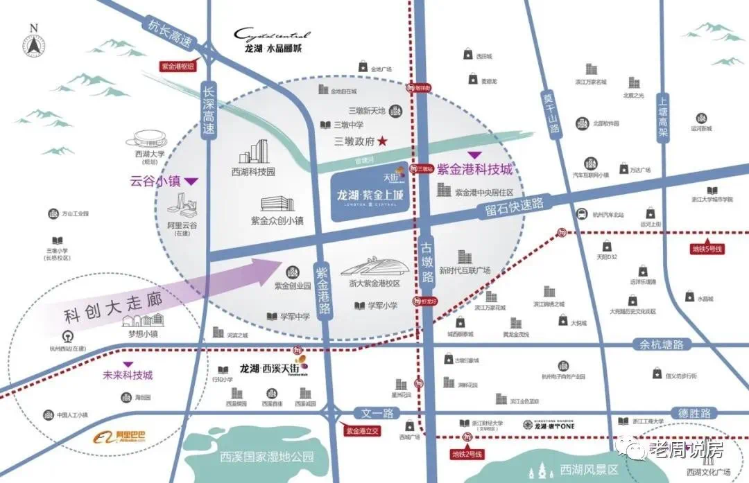 龙湖•紫金上城,是龙湖集团在城西继西溪天街之后,布局的第二座天街综合体,杭州商业迭代创新之作。项目距浙大紫金港校区约500M,是中国“硅谷”城西科创大走廊的起点,政策重点规划,紧挨三墩政府等行政机构。紫金众创小镇、西湖科技园、阿里云谷、西湖大学等产业环伺,人才集聚,是西湖区最有发展潜力的板块之一。龙湖•紫金上城与地铁2号线无缝衔接,紧靠留石快速、紫金港立交枢纽。整合商业TOP天街系、城市塔尖居住产品、独栋旗舰商业于一体,目前首批次小面积天街资产正在预约。