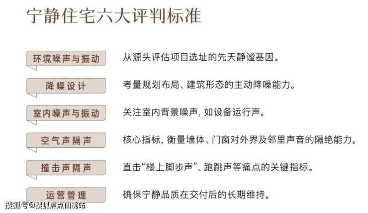 整体从环境噪声与振动、降噪设计、室内噪声与振动、空气声隔声、撞击声隔声、运营管理六大维度,从环境静、室内静、邻里静出发,对住宅的声环境进行严苛评分。