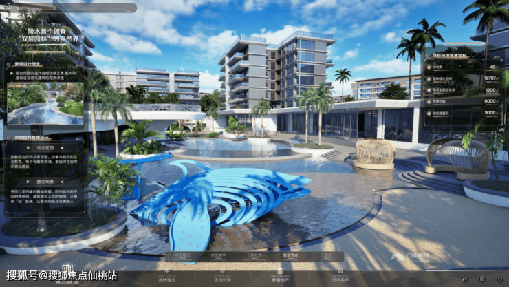园林景观部分,项目拥有“双层园林”景观设计,以海洋为主题,采用成熟植株,打造海浪泳池、沙滩营地、鲸鱼乐园、海岛绿洲、海崖花园六大景观系。