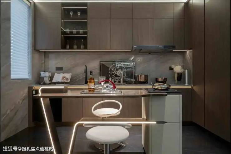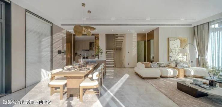一体化餐客厅与阳台,首层约35㎡客餐厅,横向进深延伸至9米