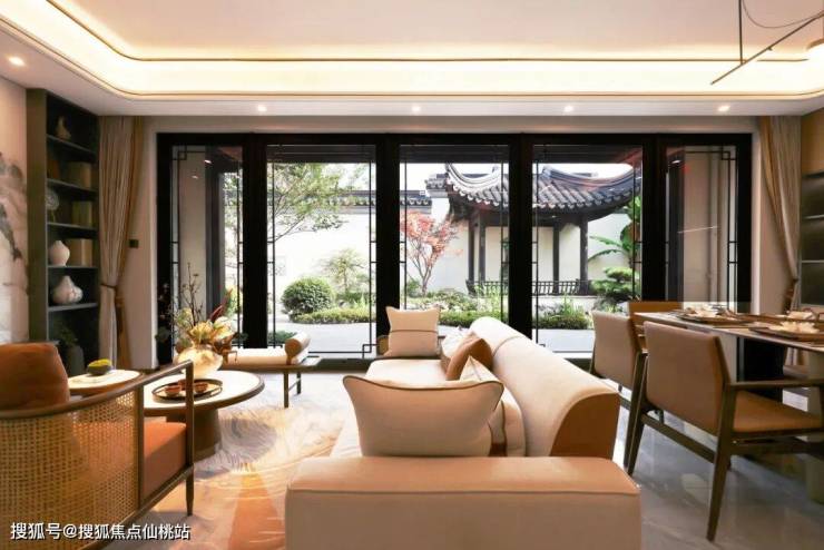 庭院是长者与主人偏爱的静谧角落。紫藤架下,一方茶席已备好。月色如水银泻地,透过精雕细琢的落地长窗,将斑驳的光影洒在室内。
