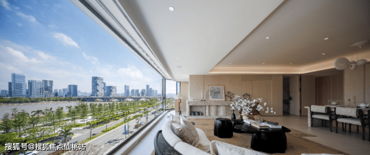 建筑外立面主打“现代精奢+滨水美学”,采用非对称布局,营造“大实大虚”通透视觉效果,横向线条舒展,落地玻璃窗与 270°转角全景窗无缝衔接,让江景与自然光成为空间主角,成就宽幕观江的极致体验。
