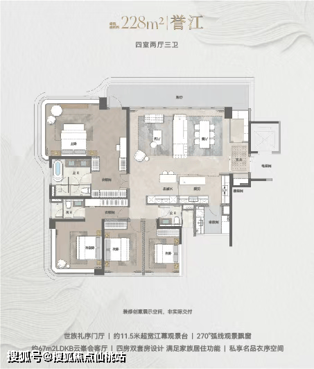 02.舒适宜居:T3 的梯户比能保证居住的私密性,270° 的环幕飘窗、超宽的观景台,还有 0.36 的高窗地比,能把江景最大限度引入室内;LDKB 一体化的洄游方厅、双套房的设计,能满足一家人的居住需求,架空层的泛会所里有亲子、健身、会客等区域,适合各个年龄段的人生活。