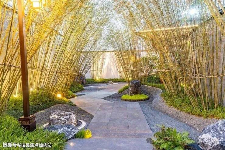 【叁进·茂林修竹】以竹林为特色,结合景石、流水等景观元素的运用,营造曲径通幽的清雅体验,欲扬先抑,引人入胜。