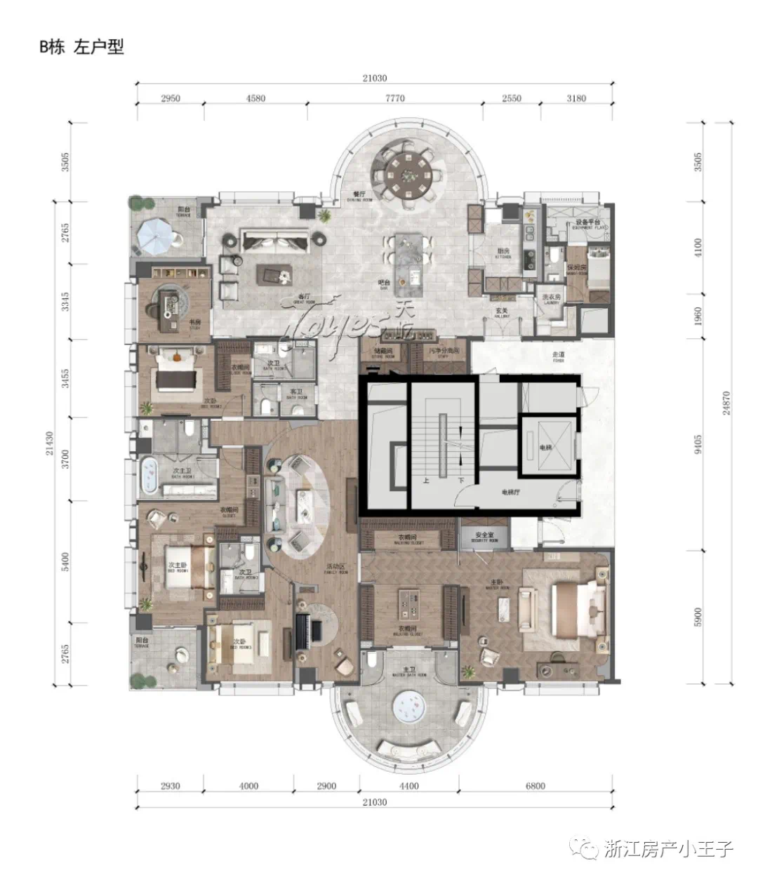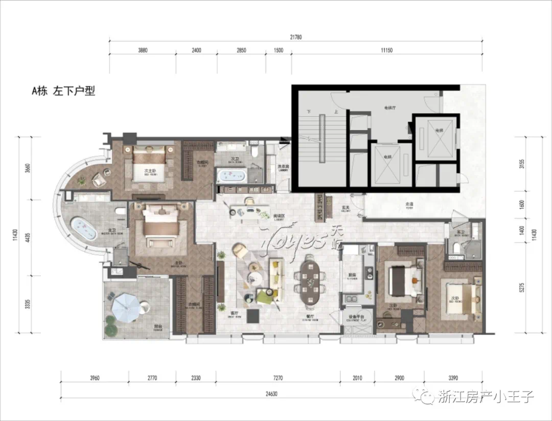 户型:A栋 在售面积:255.4(A栋 右下户型)—274.3方(A栋 左下户型)B栋 在售面积:493.58—496.83方(B栋 左户型)