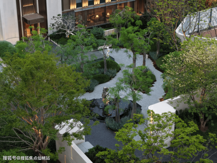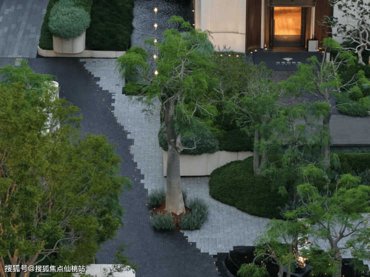入口形象、落客系统与花园空间被重新整合,形成连续延展的城市展示面——车辆从都市干道转入,首先遇见的不是冰冷的道闸,而是一道艺术化的入口景墙与树影婆娑的花园式落客区。优雅的艺术氛围,悄然为来访者铺陈出对未来住区景观的浪漫想象:归家之路可以如此从容而精致。