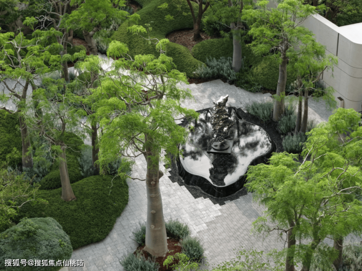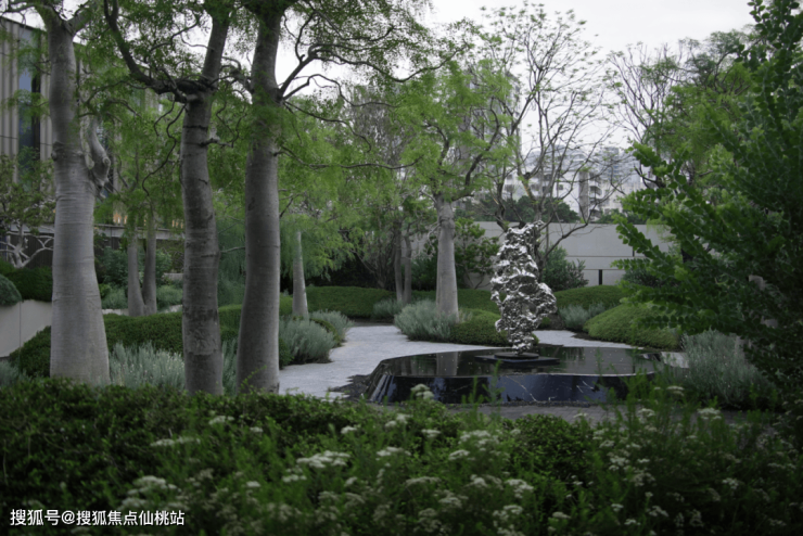 植物设计强调结构与秩序,以稳定的绿篱界定空间边界,以自然生长的乔木形成上层遮荫。而灌木层的营造,则是这场花园叙事中最具雕塑感的一笔:精选的灌木被修剪出圆润而富有张力的体块,在光影下呈现艺术流淌的浪漫肌理。同时,种植策略刻意预留了柔软的溢出边界:一些蓬松舒展的品种被允许自由地漫过池壁边缘,繁茂的枝叶层层叠叠地探向步道与水岸。这份不加拘束的生机感,带来了被自然温柔包裹的治愈气息。整座花园的种植策略既关照当下的展示效果,也为未来的长期社区景观预留了延续的可能。