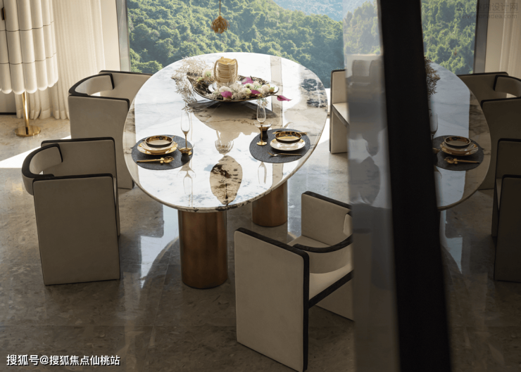 彼方碧海,此处青山,餐厅酒柜层层圆润,形如开合的贝壳,多角度的金属曲面将浮光折射,为入夜后的酒精加冕。餐椅黑与白的搭配结合C形的弧线,既是空间调性的点缀,也是向Chanel经典配色和图标的永恒致敬。