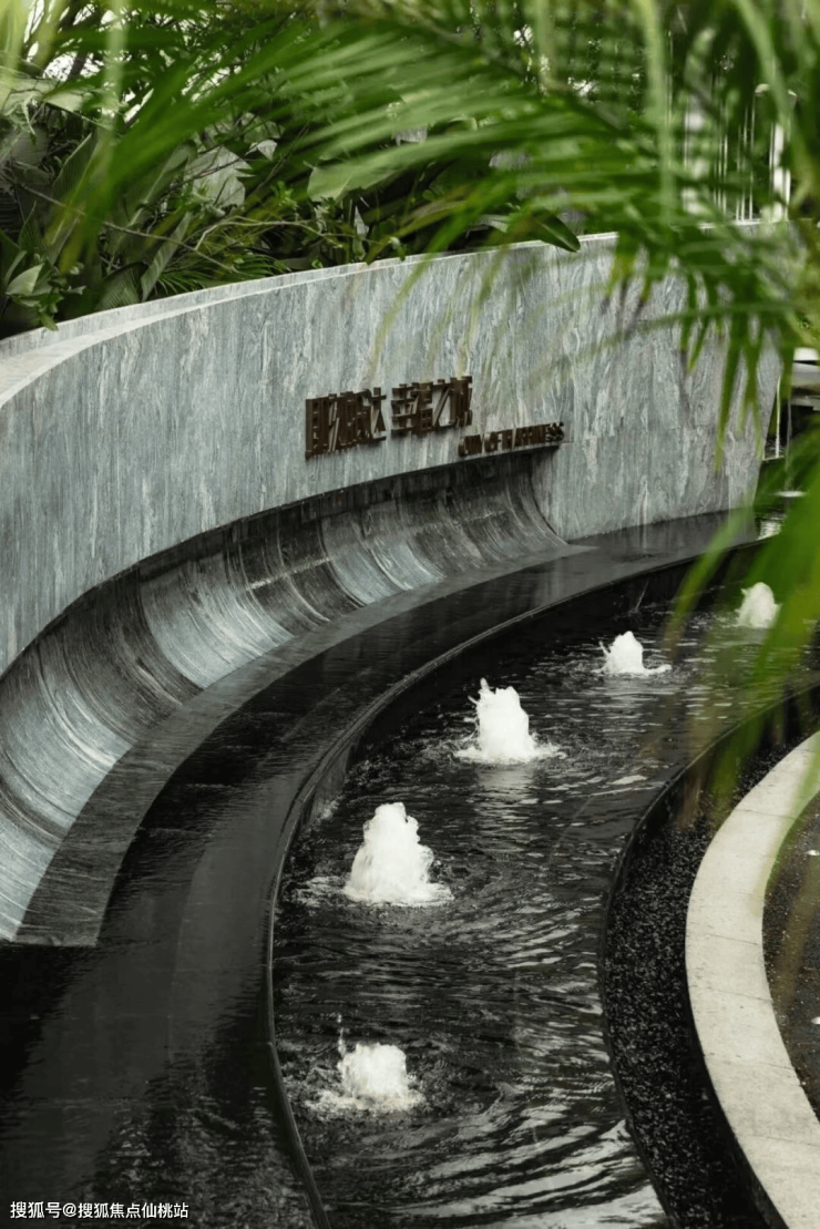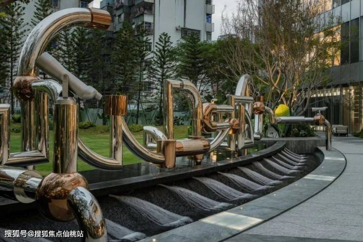 入口处的跌水景与特色艺术装置相映成趣。水景如潮汐般律动变化,共同形成吸引人驻足、汇聚的视觉焦点。