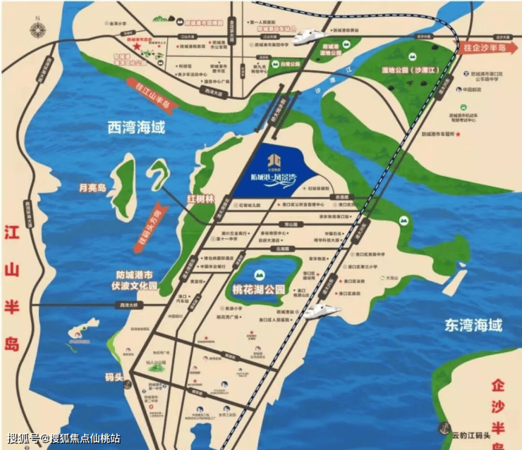 休闲配套:白鹭公园、湿地公园、北部湾海洋公园、沿江沿海休闲步道、红树林。