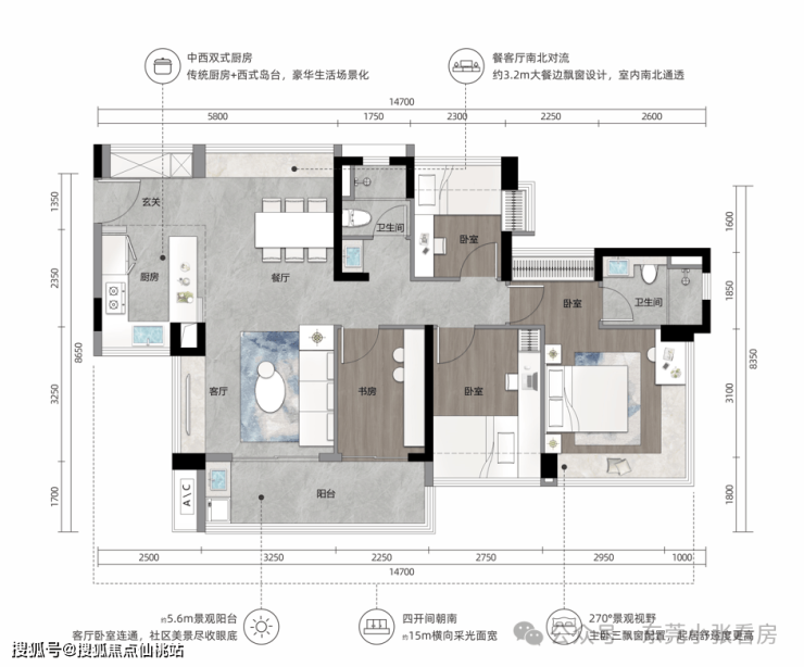 中式厨房配备西厨岛台,LDK一体化设计,约5.6m景观阳台,约12m四开间朝南,主卧三飘窗+270°景观面,豪宅因素一个都不少