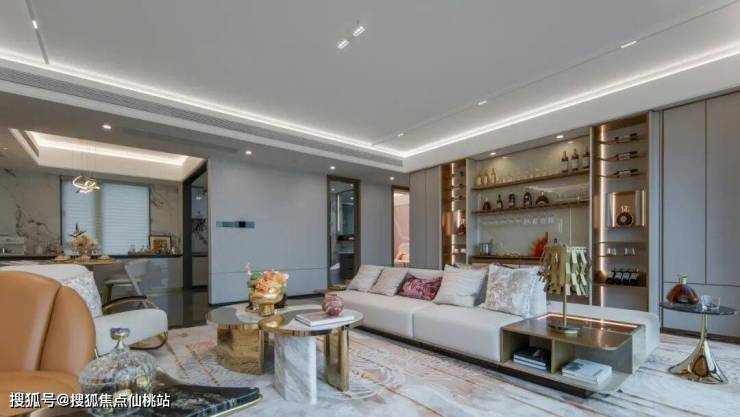 为层峯营造一方静享与沉浸的天地,匠造雅致会客书吧,家具选型考究,边角圆润,蛇形沙发流线优雅,铜丝画光影交错,嵌入长桌吧台等全场景交互,定制层峯圈层睦邻生活场的书香气。