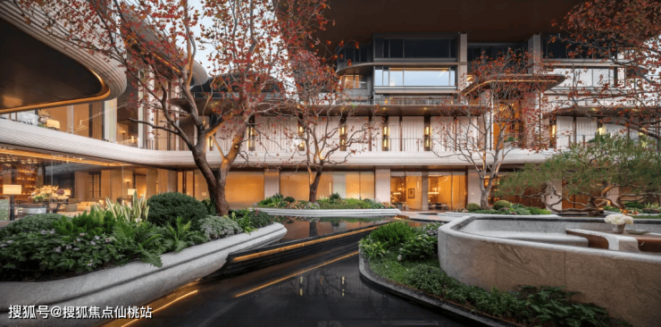 这个巨型中庭花园的设计灵感源自标悉尼嘉佩乐酒店,由一条长260米的全域风雨连廊连接各个景观节点,确保确保业主自从进入小区到回家都不用淋雨。