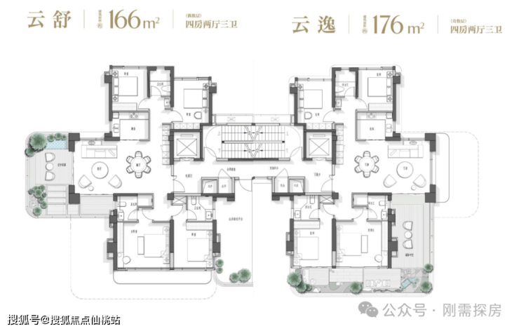 166、176平:四房两厅三卫,进深大面宽小的设计,主卧空间相对阔错,不过卫生间偏小,客厅空间依旧一般,甚至可以说偏小。