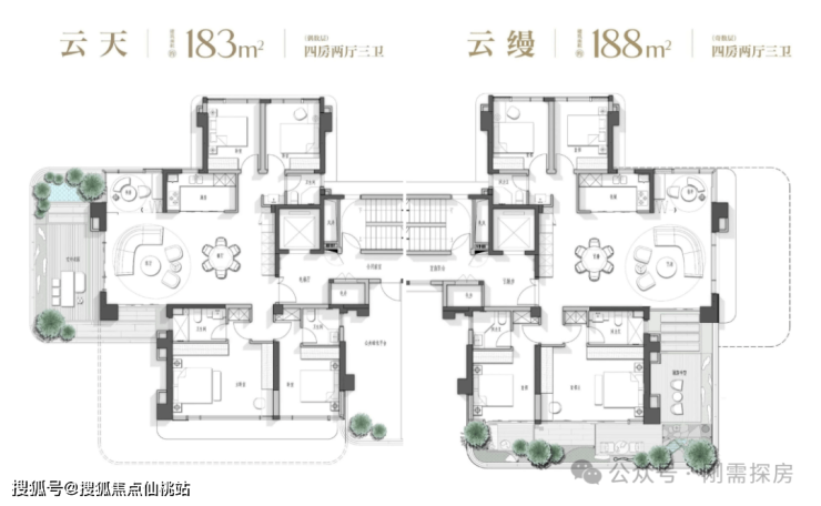 183、188平:四房两厅三卫,166、176略微升级版,主卧面宽加大,三个卫生间还是局促,其他三个房间尺寸也是一般。
