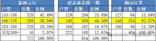 对比隔壁的建总流花溪一期,以及烟山江翠,项目由于四代宅起步高达155平,其中50%的户型都在166平以上。
