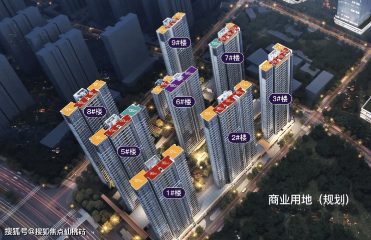 社区设置8栋14-34层高层住宅,分三排布局,打造建面约90㎡、121㎡、135㎡及190㎡共4种户型