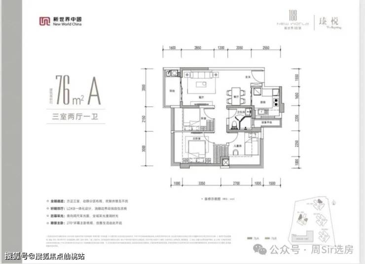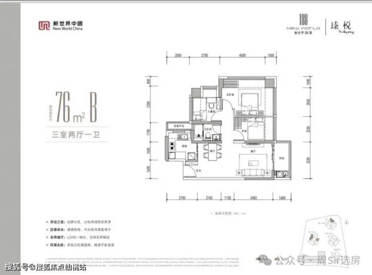 76㎡的3房2厅1卫,设计的是竖厅格局,客厅3.3米开间,LDKB一体化设计,动静分区,分别做到了主卧12.3㎡/次卧11.02㎡/次卧8.28㎡(包含墙体飘窗),U型厨房,卫生间干湿分离,同时带1个设备阳台约1.5㎡,阳台约5.28㎡东北、西北或东南朝向。