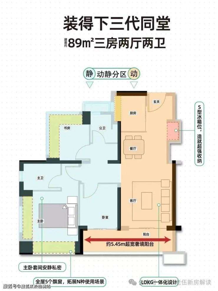 89㎡的3房2厅2卫,02.03户型,设计的是经典竖厅格局,客厅3.4米开间,LDKB一体化,S墙设计预留冰箱卡槽位,动静分区,三开间朝南,3个卧室分别做到了主卧13.79㎡/次卧7.62㎡/次卧6.93㎡(包含墙体飘窗),主卧+1个次卧270°飘窗设计,U型厨房,公卫三段式分离,客厅连接卧室出5.75米长的大阳台,得房率约87.2%(包含赠送),东南朝向。