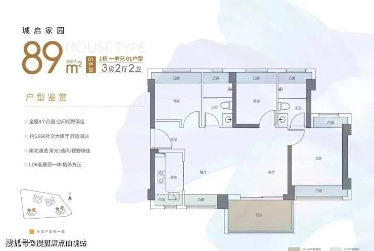 89㎡的3房2厅2卫,01.06户型,设计的是横厅南北通透格局,客餐厅6.12米开间,LDKB一体化,四开间朝南,主卧双飘窗南北通设计,3个卧室分别做到了主卧13.6㎡/次卧8.83㎡/次卧7.59㎡(包含墙体飘窗),L型厨房,卫生间干湿分离,得房率约91.14%(包含赠送),阳台主朝西南或东南向。