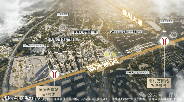 地铁:紧邻地铁3号线、7号线汉溪长隆站(步行约8分钟),距离18号线南村万博站1.2公里。