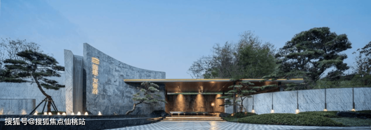 隐奢典藏大门,奢石景墙,造型有 “开卷望府” 寓意。入门处的水景及造型叠水,寓意聚水引财。