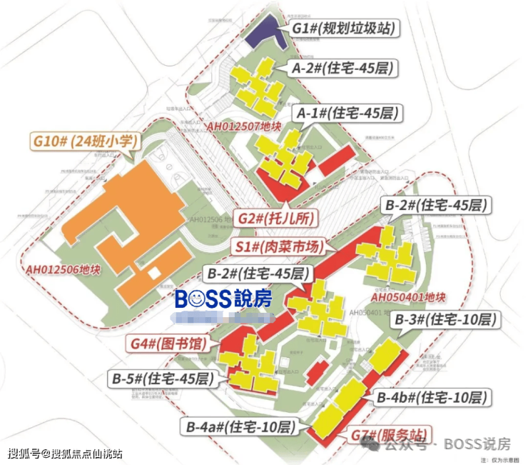 项目主要分为南北地块来规划,北地块规划了2栋超高层洋房,托儿所和24班宝玉直小学,南地块规划了3栋超高层洋房,2栋小高层板楼、和图书馆。