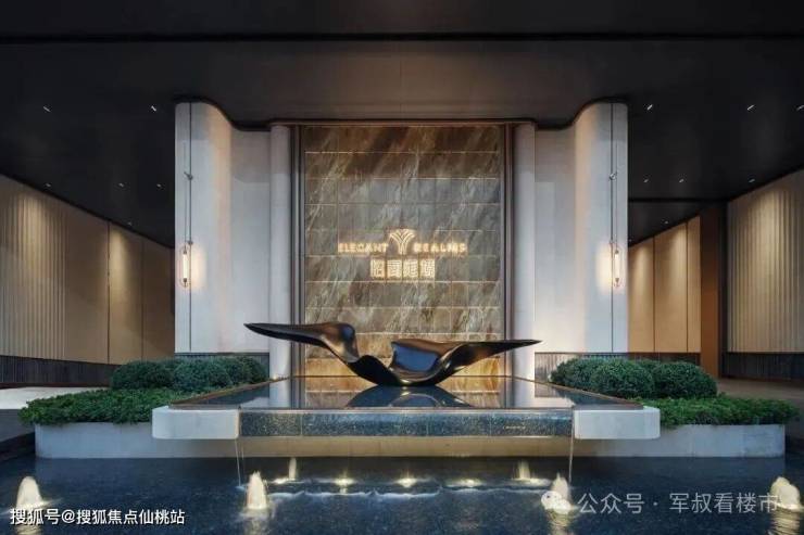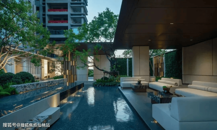 园林设计上,森系度假美学景观,公区质感跃级,优选石材、铝板、铝格栅等,入户大堂奢华感拉满。