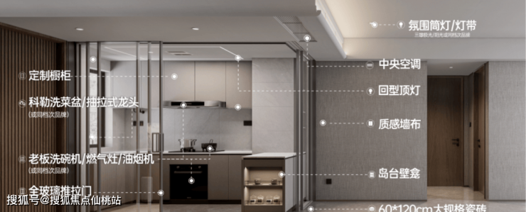 入户赠送收纳功能强大的玄关柜,厨房天花采用石膏板+回型灯设计,客餐厅天花弧形吊顶、地面采用大地砖,造价更高、更耗时耗力,也更美观。