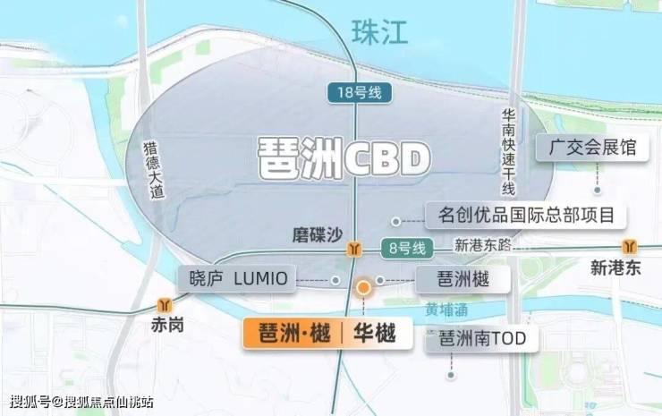 最近的地铁,还是琶洲西区最核心、8/18号线双线交汇的磨碟沙地铁站,仅隔着一条新港东路,直线距离约200米。