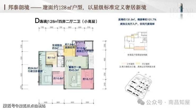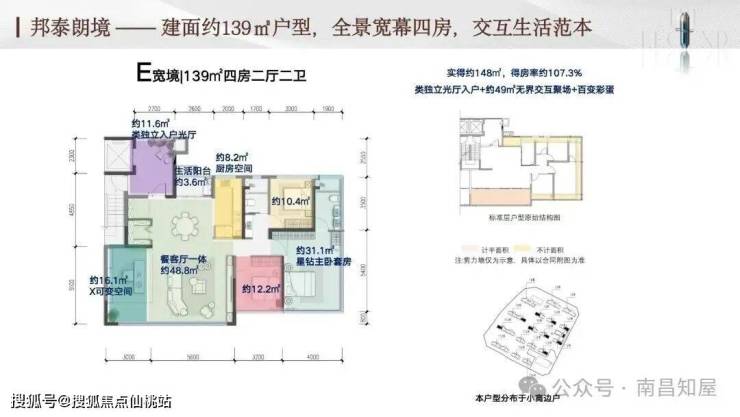 项目涵盖 100 - 139㎡多个面积段,适配刚需与刚改人群。高层得房率达 90%-97%,小高层更是高达 101%-105%。小高层 128㎡和 139㎡为专梯专户,128㎡带有约 10 平独立电梯厅;139㎡作为王牌户型,采用南北双阳台布局,主卧带全景窗,空间视野极佳。部分户型还通过山窗墙设计、180 度全景窗等解决采光问题,同时灵活利用设备平台,提升空间利用率。
