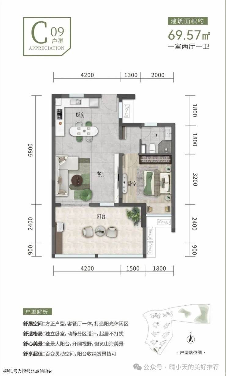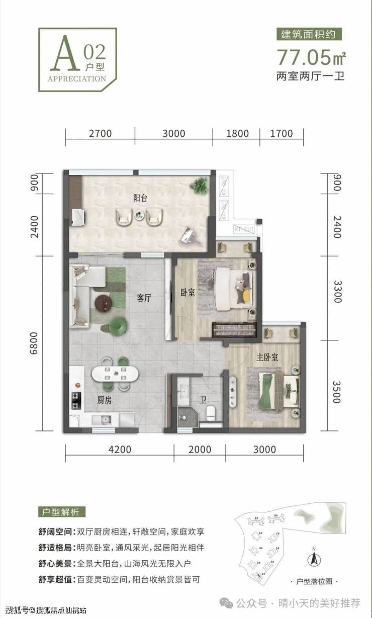 建筑面积约69-104㎡一至三房,方正开阔空间,户户阳台,动静分离,功能分区,厨房、阳台等多功能配套,全能居家,旅居休憩或家庭度假皆可。