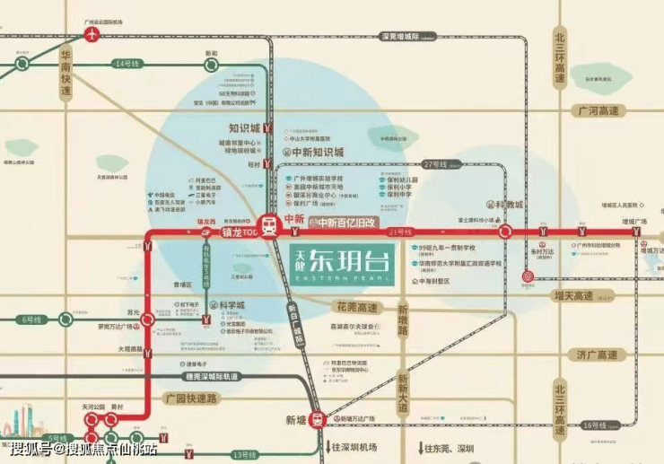 地铁——直线距离广州地铁21号线中新地铁站800米左右,1站到镇龙站(14号线),2站科学城,3站到天河;21号线直达员村、14号线串联知识城、27号线直达新塘交通枢纽(规划);城轨有新白广城轨(镇龙站到广州白云机场、深圳机场);莞深-新白广城际穿梭大湾区核心城市(北至广州北站、白云机场,南达东莞虎门火车站、深圳宝安机场,西连佛山西站、广州东站等);