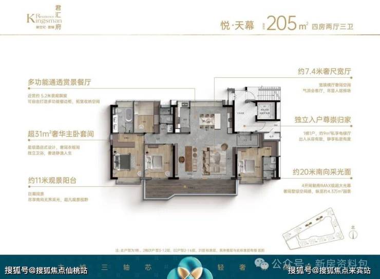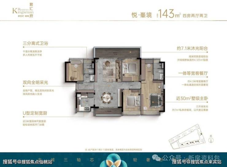 • 市场上大多户型设计以紧凑为主,在小面积内满足基本居住需求,新世纪深耕东莞25年,深知东莞客户的居住习性,致力于打造更奢阔的空间尺度,君汇府规划约103-143㎡舒阔三至四房,约205㎡臻稀大平层,以阔境见高下,谨为品质生活而生。