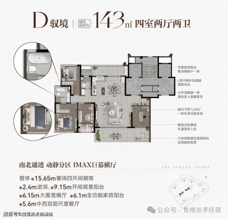 专属家政阳台集洗晒晾于一体,L 型中厨外加预留西厨岛台,大开间餐厨一体,满足多人就餐需求。超尺寸的 “LDKG” 一体化多功能空间,让生活更加便捷。奢适主卧套间,尽显品质生活。大进深跑道式观景阳台,可近赏园林美景。南北通透,动静分区,IMAX 巨幕横厅,整体 15.65m 奢阔四开间朝南,给人极致的居住享受。