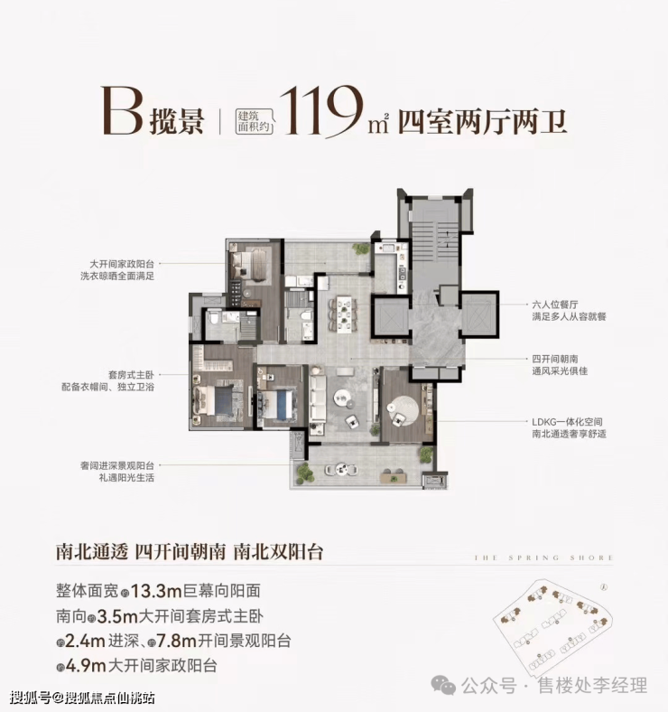大开间家政阳台满足洗衣晾晒需求。六人位餐厅可让多人从容就餐。四开间朝南,通风采光绝佳。LDKG 一体化空间,让活动区域更宽敞。南北通透,奢享舒适生活。奢阔进深景观阳台,尽情享受阳光。南向 3.5m 大开间套房式主卧,还有 2.4m 进深、7.8m 开间景观阳台以及 4.9m 大开间家政阳台,整体面宽 13.3m 巨幕向阳面,居住体验超棒。