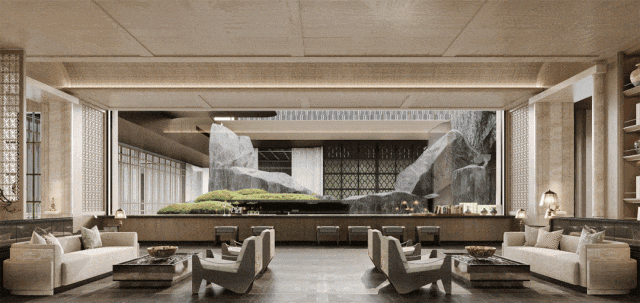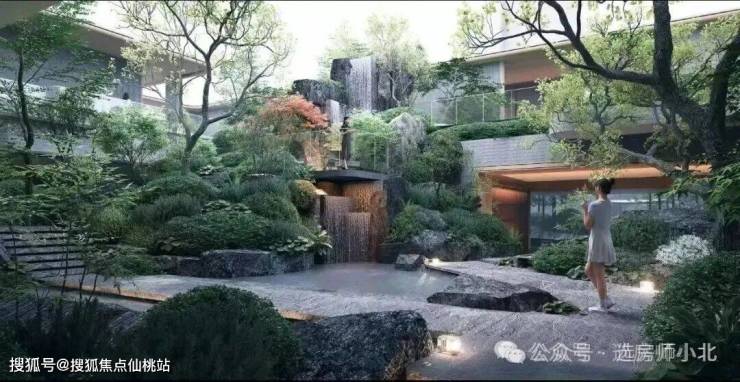使用岭南园林「藏水于庭」的技法,在这里打造了一座立体花园,既承浣红跨绿之韵,又化山野飞瀑为庭中景