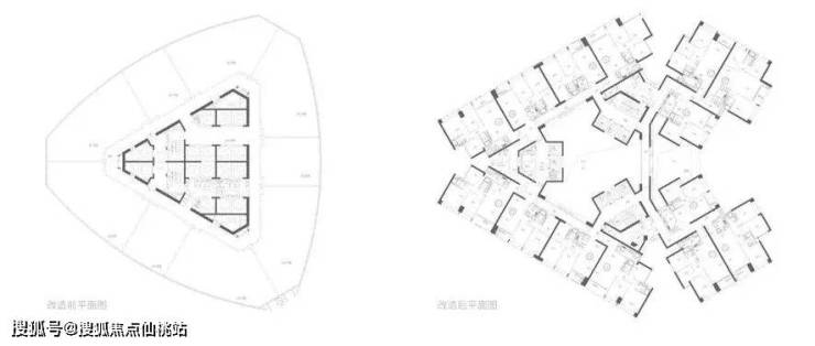 由于项目定位为商务居住性能,建筑师对原本封闭的办公式标准层平面进行优化。修改后的标准层平面中,保留两侧景观最优的完整面,新结构尽量落位在原核心筒区域,将中间掏空为采光中庭,景观资源较差一面对外开放,创造更适宜居住空间的通风采光环境。