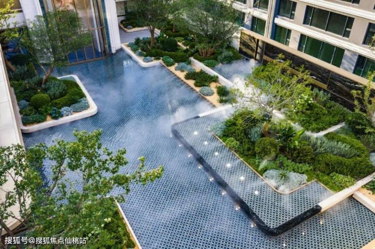 庭院内以大面积水景为核心,层叠的花池错落穿插,营造出丰富的高差与视觉节奏。
