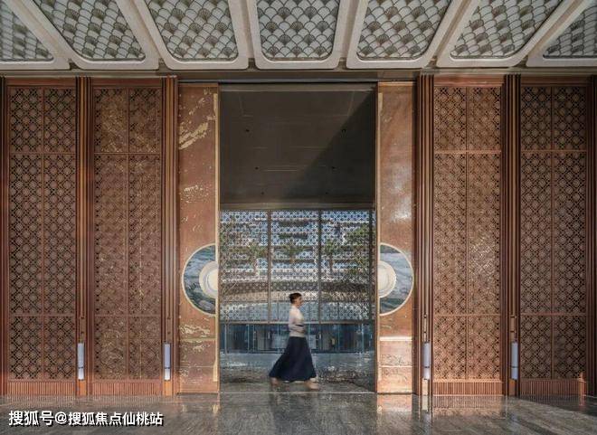 历时580小时匠造打磨的汉白玉凤凰雕塑《有风来仪》,质感细腻温润,与嵌入贝金米黄石材的铺装自成一体。近6米高,由非遗大师朱炳仁大师监制的铜门缓缓开启...